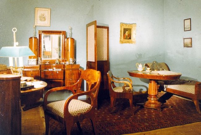 In a small living room the coziest and warm in the house, poet`s relatives, neighbors and friends from the boarding house and university often met. On the secretaire are the books which Lermontov and his friends were deeply read in “The Song of the Bell” by Friedrich Schiller and “Brothers robbers” by A. S. Pushkin.