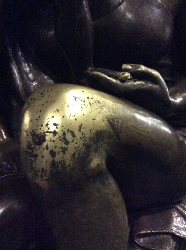 До остальных фигур тоже дотрагиваются, но не так часто. Видимо, доверие вызывает больше всего пограничный пес. Поэтому бронзовый слой его морды сильно истончился, и фигура может оказаться под угрозой «исчезновения» (не сотрется совсем, конечно, но могут убрать или огородить).Почему все любят именно собаку? Есть много версий, но ни одна не подтверждена.