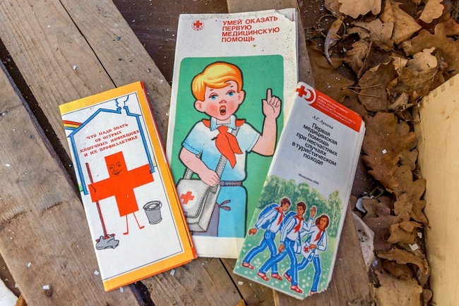 Обнаружив медпункт, я ожидал найти много интересного, но был разочарован сломанными пипетками и одной стеклянной банкой. Вся мебель медпункта представлена столом для врача и кушеткой для маленьких пациентов. А в маленькой каморке обнаружил линейку для измерения роста. Сейчас в больницах, наверное, таких и нет уже, а я прекрасно помню их в детской поликлинике и в детсаду.