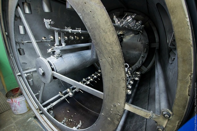 Следующая стадия изготовления игрушек: метализация. Внутрь металлизатора на специальных трубках помещают прозрачные стеклянные игрушки и алюминиевые пружины. Металлизатор герметично закрывается, и под термическим воздействием алюминий начинает испаряться и оседать на стекло. Таким образом игрушки приобретают зеркальную поверхность.