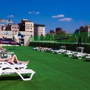 Площадка с шезлонгами и зонтиками, устланная мягким искусственным газоном, расположена на крыше бассейна, откуда открывается прекрасный вид на центр столицы. Освежиться можно с помощью оборудованного здесь душа или поплавать в самом бассейне.