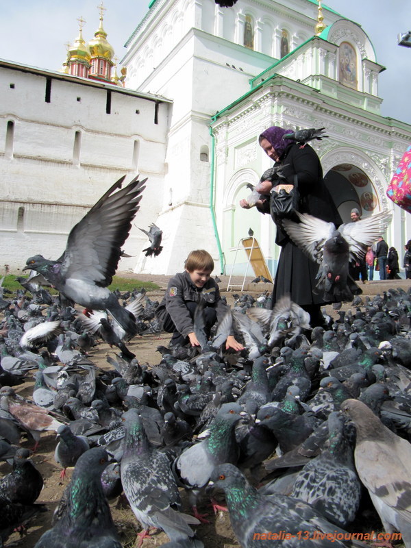 2. Пройдя мимо церкви Параскевы Пятницы и Введенского храма, мы увидели монастырские стены и купола церквей. Вдоль лестницы, ведущей ко входу в Лавру, раскинулся базар с сувенирами. На лотках можно приобрести изделия на любой вкус: русскую матрешку, магниты с изображением монастыря и Сергиева Посада, наперстки, платки, красиво расписанные деревянные елочные игрушки, шкатулки, лубочные изделия и много всего прочего, что обычно продают в подобных местах.