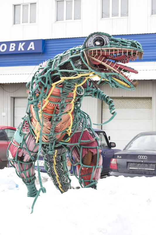 На пересечении Пятницкого шоссе с улицей Барышиха около рынка «Товары для дома и сада», на автостоянке был обнаружен вот такой очаровательный зверь. Сразу вспомнились слова из песни Алены Апиной: «Я его слепила из того, что было. А потом что было, то и полюбила». Швабры, шланги, ложки, грабли, чего только не найдешь.