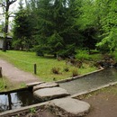 Идя от беседки по дорожке, мы еще не видим воду, но уже начинаем ее слышать. С нижнего пруда вода насосом закачивается в верхний пруд и оттуда через каскады и маленькие водопады спускается вниз. Водный цикл символизирует человеческую жизнь. Водопады - порывистость человеческих поступков. От рождения человек через такие необдуманные поступки приходит к умиротворению и спокойствию (медленная речка на верхнем фото).