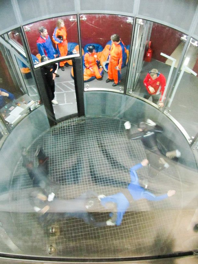 Диаметр трубы составляет 4,1 метра, а высота – 7. В верхней части конструкции установлен мощный винт, который вытягивает из нее воздух, создавая максимально ровный поток. И вот в этом потоке летаете Вы. Его скорость усиливается с увеличением угла лопастей и может достигать 270 км в час. Взрослого от земли отрывает «ветер» силой в 130 км в час.