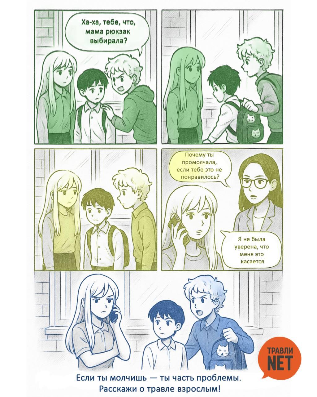 Нарисуй свой комикс — от руки, на планшете, на компьютере или даже с помощью нейросети. Главное — покажи, что травля — не норма, о ней нужно говорить, а поддержка — это настоящая сила.