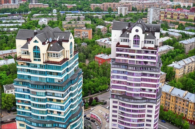 We have recently managed to reach the top of a very interesting house called "The house in the Pine Grove" ("Dom v Sosnovoy Roshe"). It takes place in the northwest of Moscow, five minutes on foot from the metro station "Oktyabrskoe Pole", and is surrounded by the beautiful pine grove. We could quickly get to the roof of the house and found out that a part of the roof was flooded.