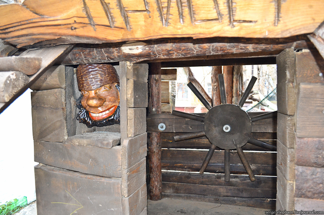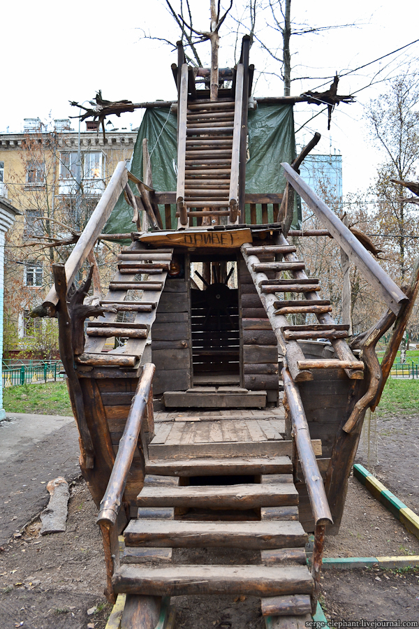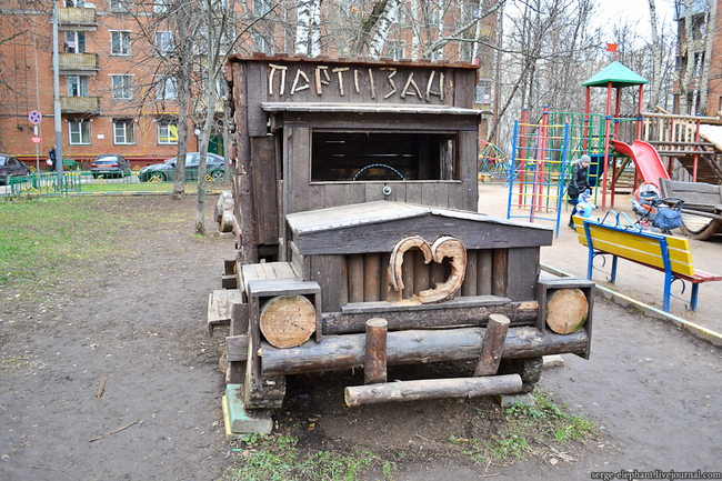In Kuntsevo district, at the intersection of two Moscow streets - Partizanskaya and Molodogvardeyskaya, there is a wonderful wooden yard for children created by a local resident, a father of three kids - Andrew Salnikov. Everything in the playground is made from wood! An automobile "Partisan" and a trailer with a cannon, a house of Baba Yaga (a famous hag in Slavic folklore), a big ship and some other objects.