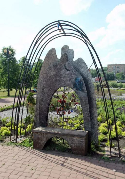 Металлическая конструкция скамейки сквозная, витая и имеет множество элементов: перила, решетки, фигурную спинку. Влюбленные могут посидеть здесь, признаться в любви и оставить на память замочек или ленточку.