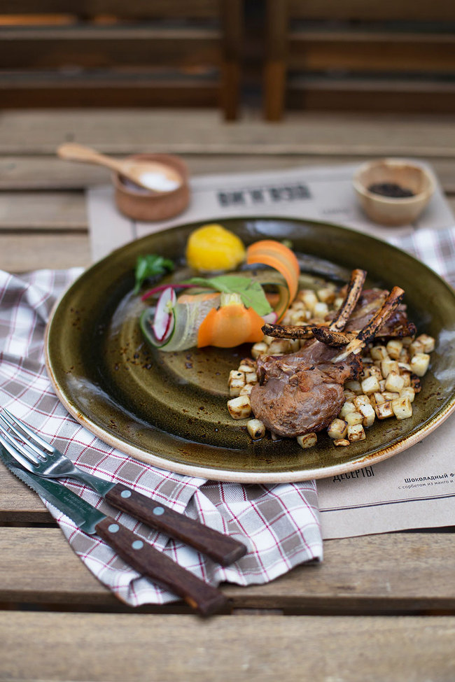 В Ви'н'Вуде он не боится экспериментировать и играть со сложными вкусами. В меню вы найдете очень интересные вещи, например, брускетта с трюфельной пастой (390р.), паштет из говядины с мятой (350р.), салат с лососем и эстрагоном (330р.), салат с печеной грушей, творожным сыром и ржаными гренками (320р.).