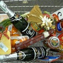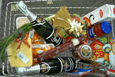 В новогоднюю корзину входят 23 продукта: по полкило мяса птицы и говядины, столько же — сырокопчёной колбасы, мясных и рыбных копчёностей, сыра, свежих овощей, белого и чёрного хлеба, а также 700-граммовая банка овощных солений, 200-граммовая банка красной икры и 200 граммов сливочного масла. Кроме того, на праздничном столе предусмотрены полтора килограмма апельсинов и бананов, 200 граммов лимонов, полкило шоколадных конфет и торт весом почти в килограмм. Из напитков предлагаются газировка и минералка, а также сок, шампанское и коньяк.