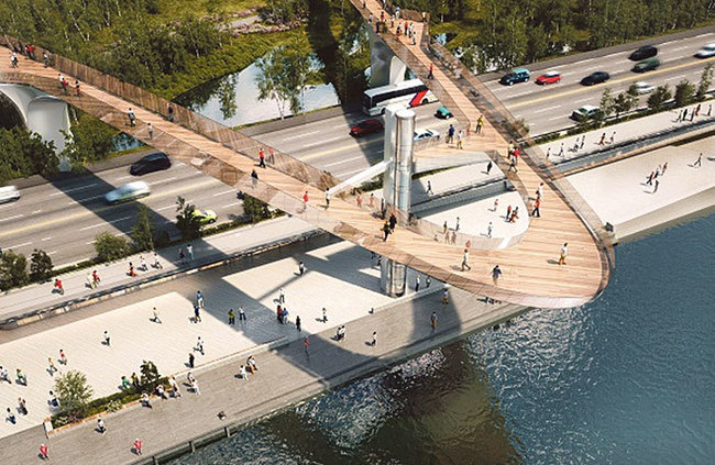 Мост позволит связать парк с рекой, а также будет служить обзорной точкой, с которой откроются виды на Кремль, парк и центральные набережные. Прозрачный лифт соединит мост с Москворецкой набережной.