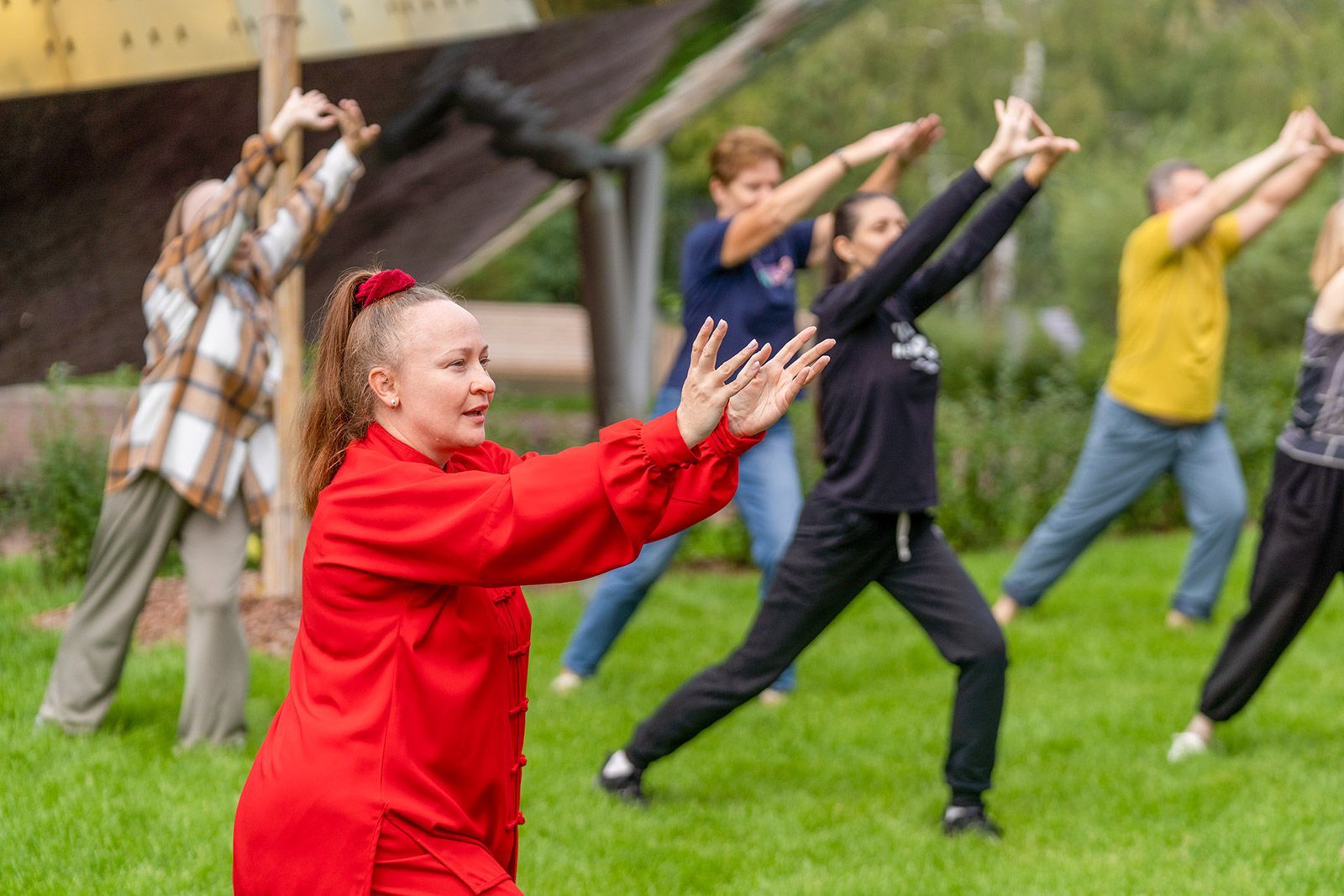 С 11:00 до 19:00 на газоне около ландшафтного аттракциона «Лента Мебиуса» гостей ждут занятия по древней китайской оздоровительной практике цигун, которая сочетает в себе физические упражнения, дыхательные техники и медитацию для достижения гармонии тела, ума и духа.