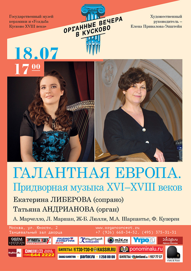 Программа «Галантная Европа» посвящена музыке великосветских дворов XVI–XVIII веков. Прозвучат сочинения, написанные придворными композиторами как для светских мероприятий, так и для исполнения в храмах, а также музыка композиторов, не состоявших на придворной службе, но, тем не менее, исполнявшихся при дворе. Екатерина Либерова (сопрано) и Татьяна Андрианова (орган) предлагают отправиться в музыкальное путешествие ко дворам Изабеллы Португальской, мантуанского герцога Гонзага, принца Саксен-Веймарского и герцога Саксен-Айзенахского. А также в Версальский дворец и Лондонскую Королевскую капеллу.