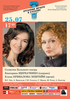 Уже шестой год подряд в течение всего лета во дворце Музея-усадьбы Кусково проводятся органные концерты: программы для органа соло, для различных инструментов и голоса с органом. В субботу, 25 июля, на фестивале «Органные вечера в Кусково» выступит ведущая российская оперная певица, солистка Большого театра Екатерина Щербаченко. За органом — художественный руководитель фестиваля, органистка Рижской церкви Св. Павла Елена Привалова-Эпштейн.