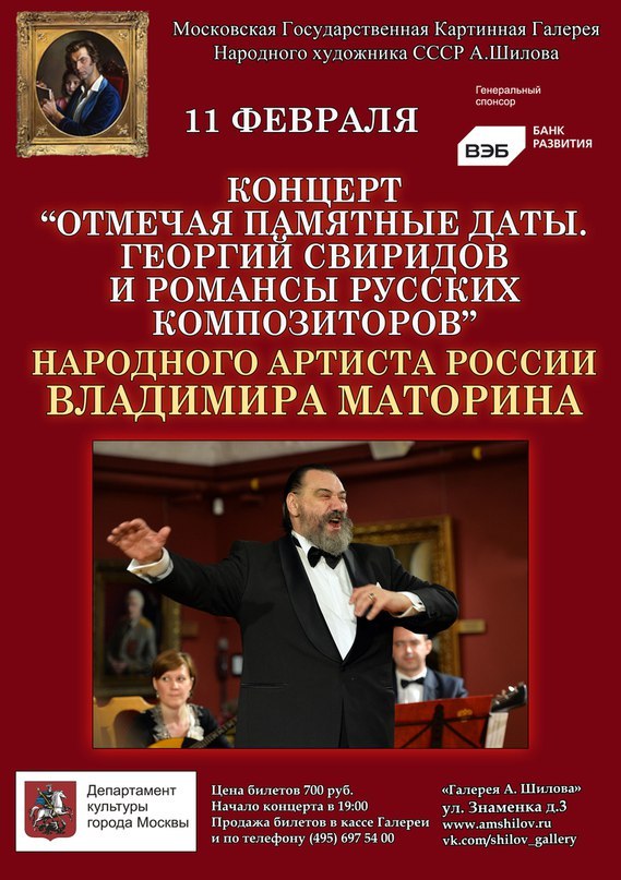 11 февраля в 19:00 в Картинной галерее А.Шилова состоится концерт «Отмечая памятные даты. Георгий Свиридов и романсы русских композиторов». В исполнении Народного артиста России, солиста Большого театра Владимира Маторина прозвучат знаменитые романсы Георгия Свиридова и других выдающихся русских композиторов.